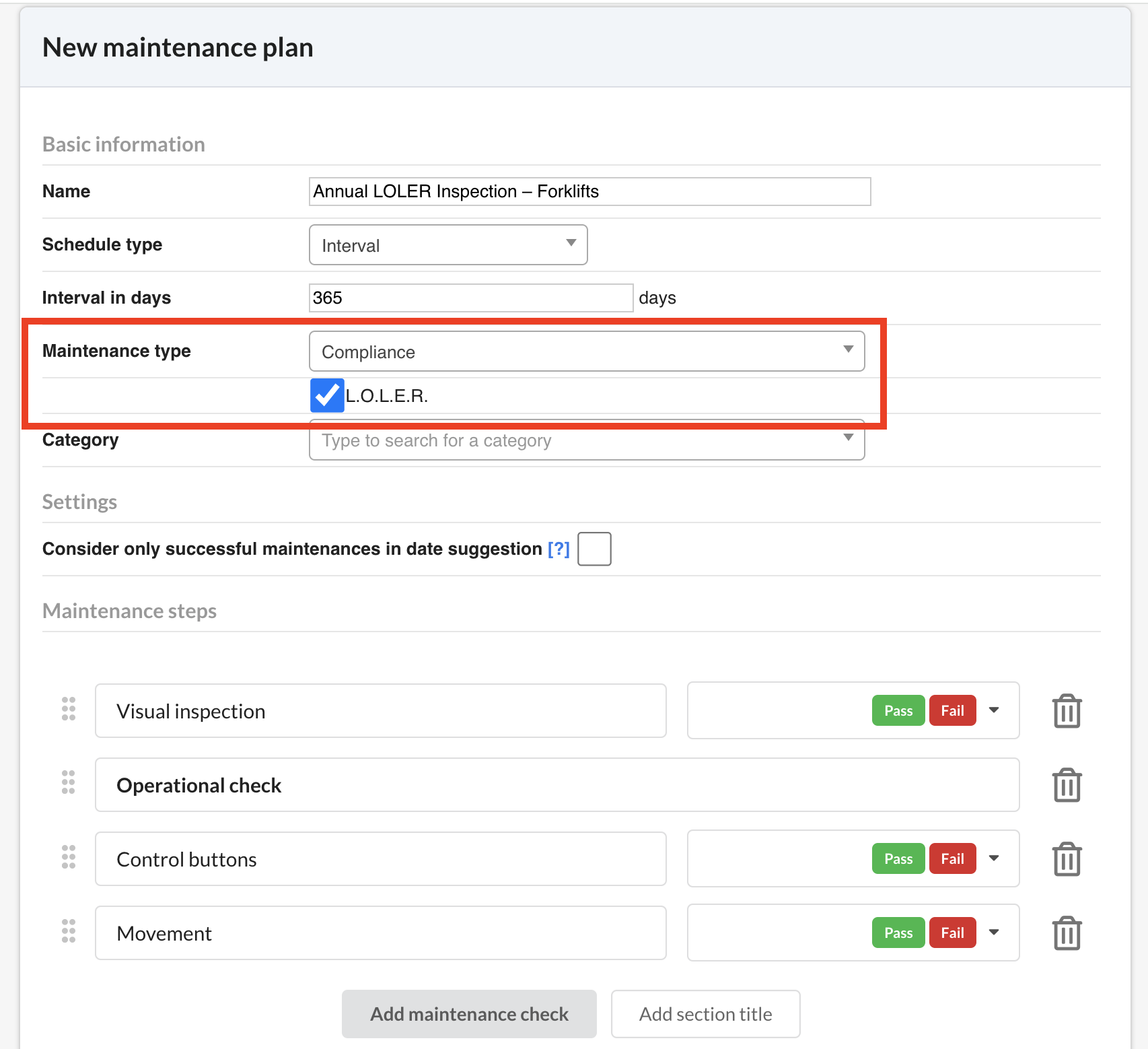 - Maintenance type: Select Compliance and check the LOLER checkbox