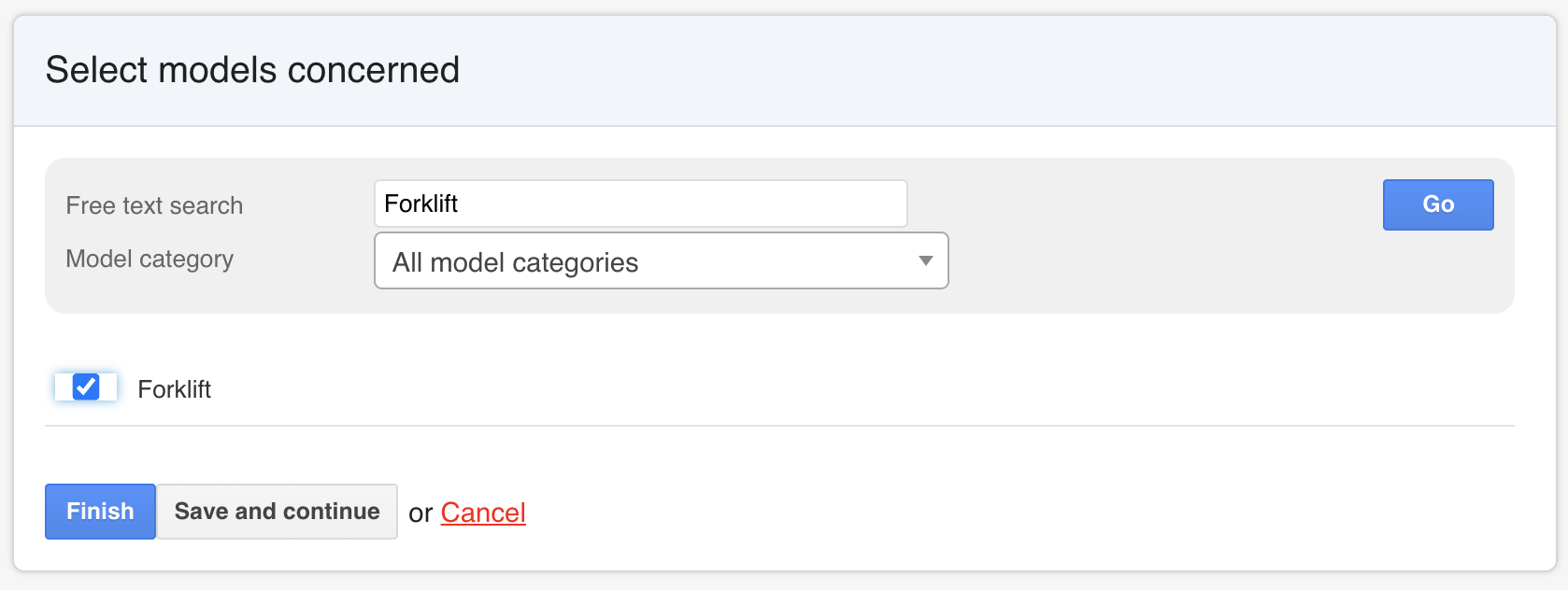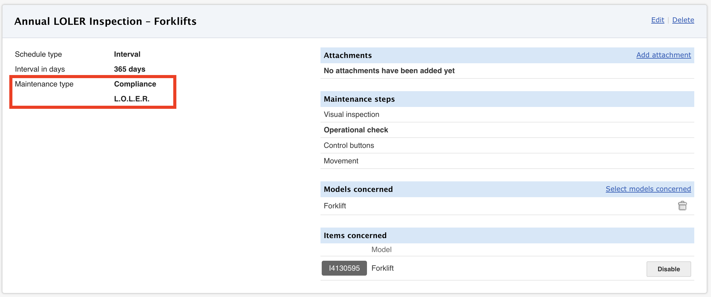 - Once saved, all items of the selected models will now have this recurring LOLER maintenance plan assigned.
