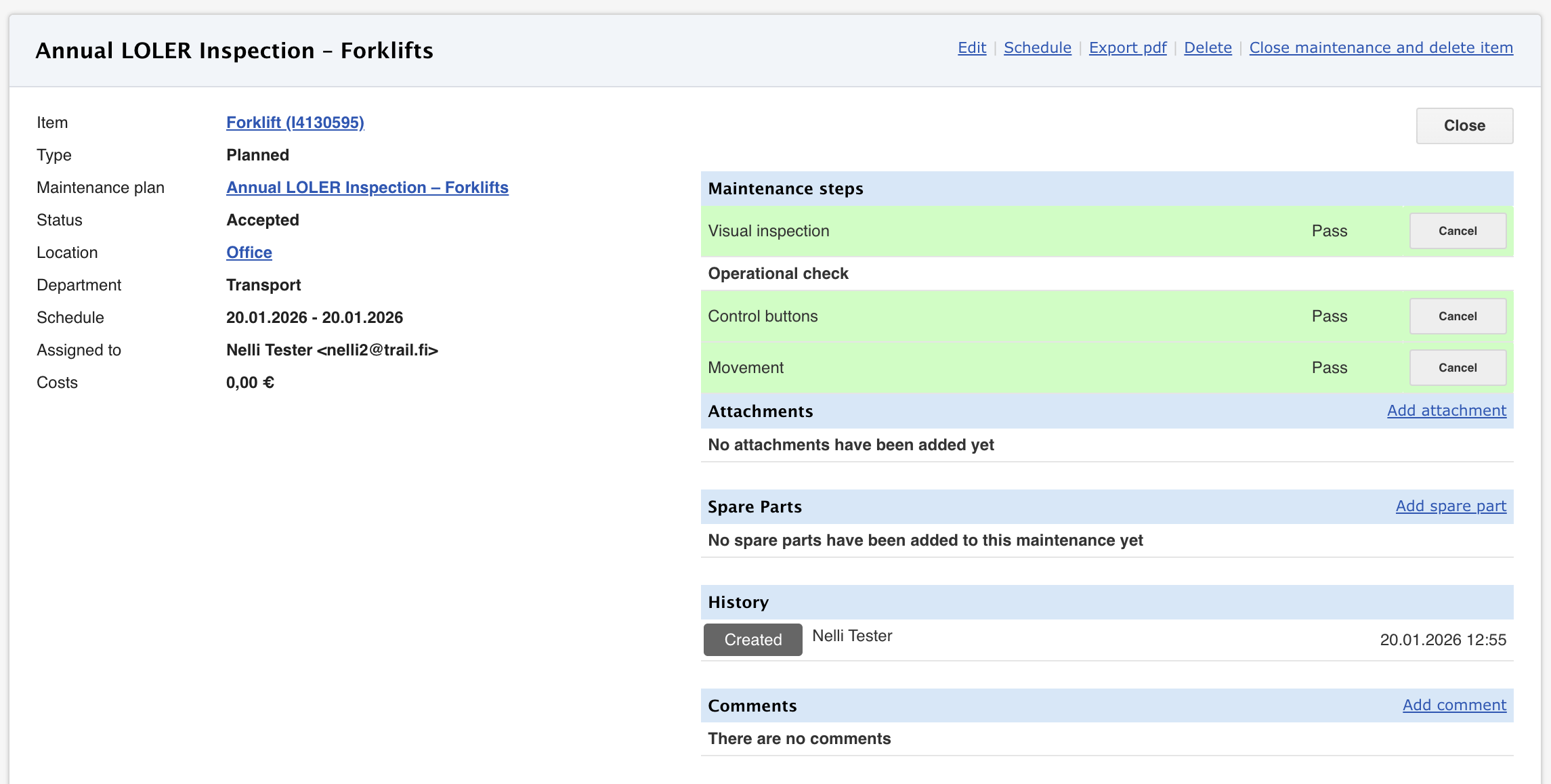 - Remember, LOLER inspections are compliance-based: once closed, they cannot be deleted, and any edits require a separate explanation.