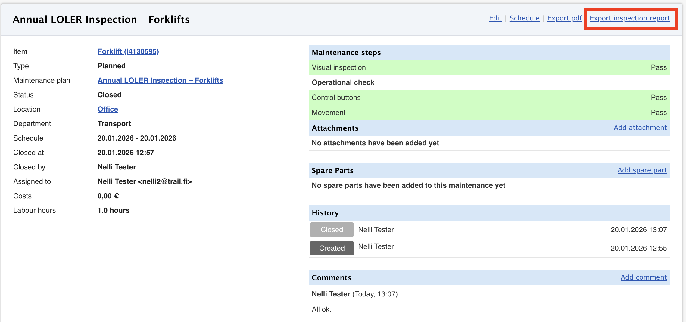- The inspection is stored in the system. You can export an inspection report from the closed maintenances page.
