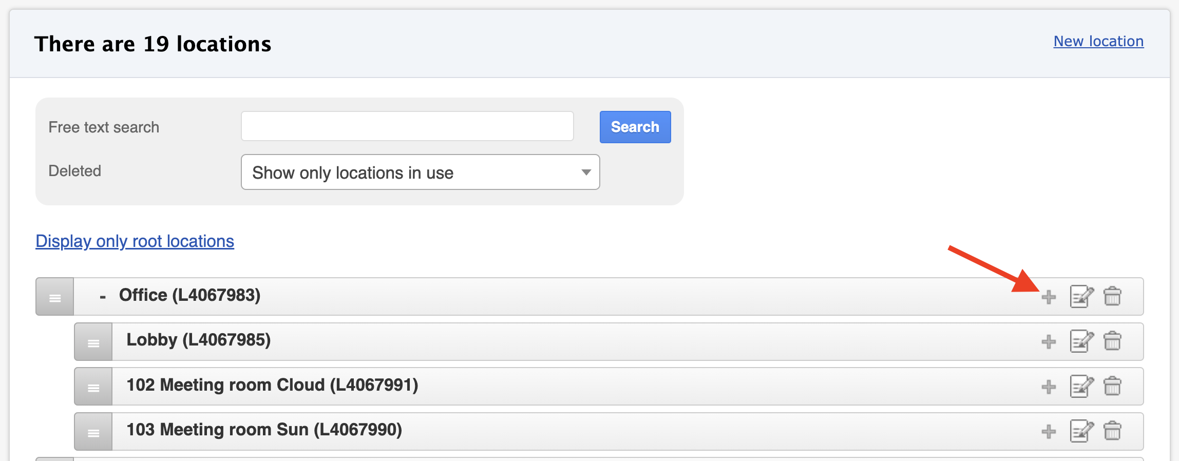 👉 Tip: Alternatively, find the main location from the list and click the + icon. The parent location will be pre-filled automatically.