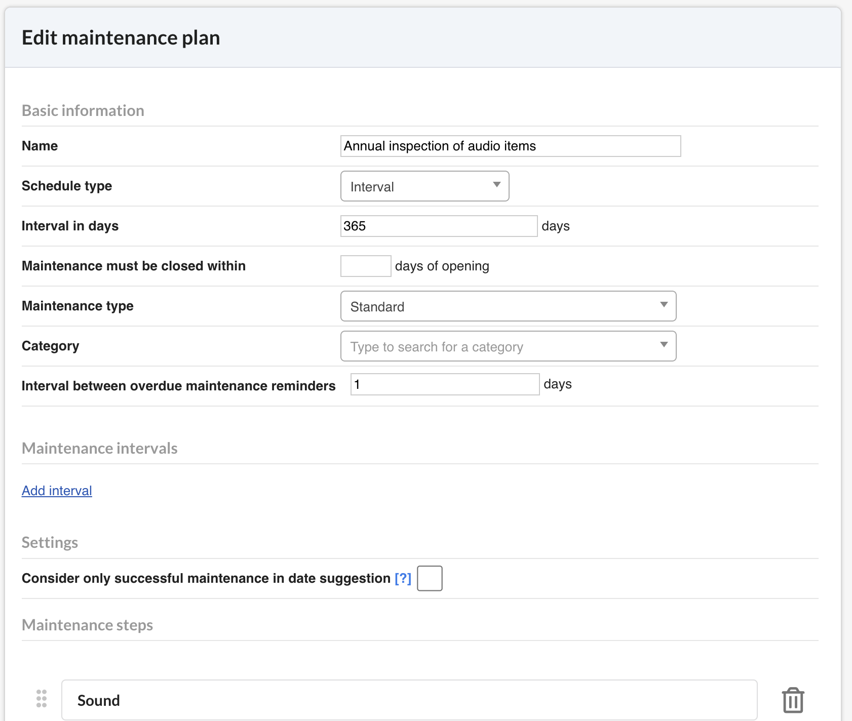 - Name (required) – Descriptive name, e.g., Annual inspection of audio items