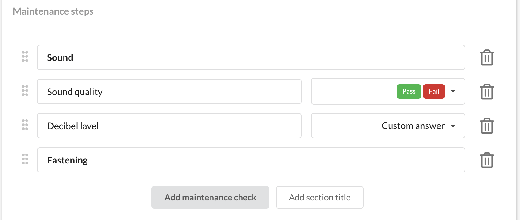 - Each step can have: Pass; Fail; N/A; Custom answer (e.g., for measurement results)