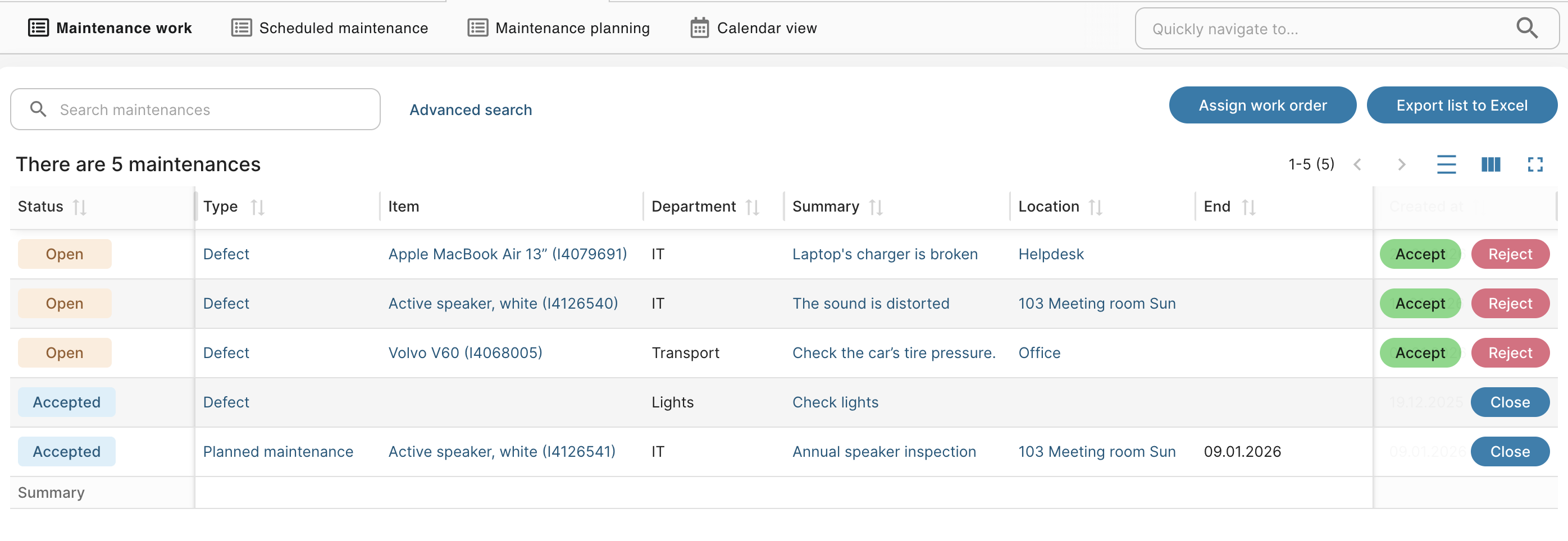 - Accepting or rejecting can also be done directly from the Maintenance work page