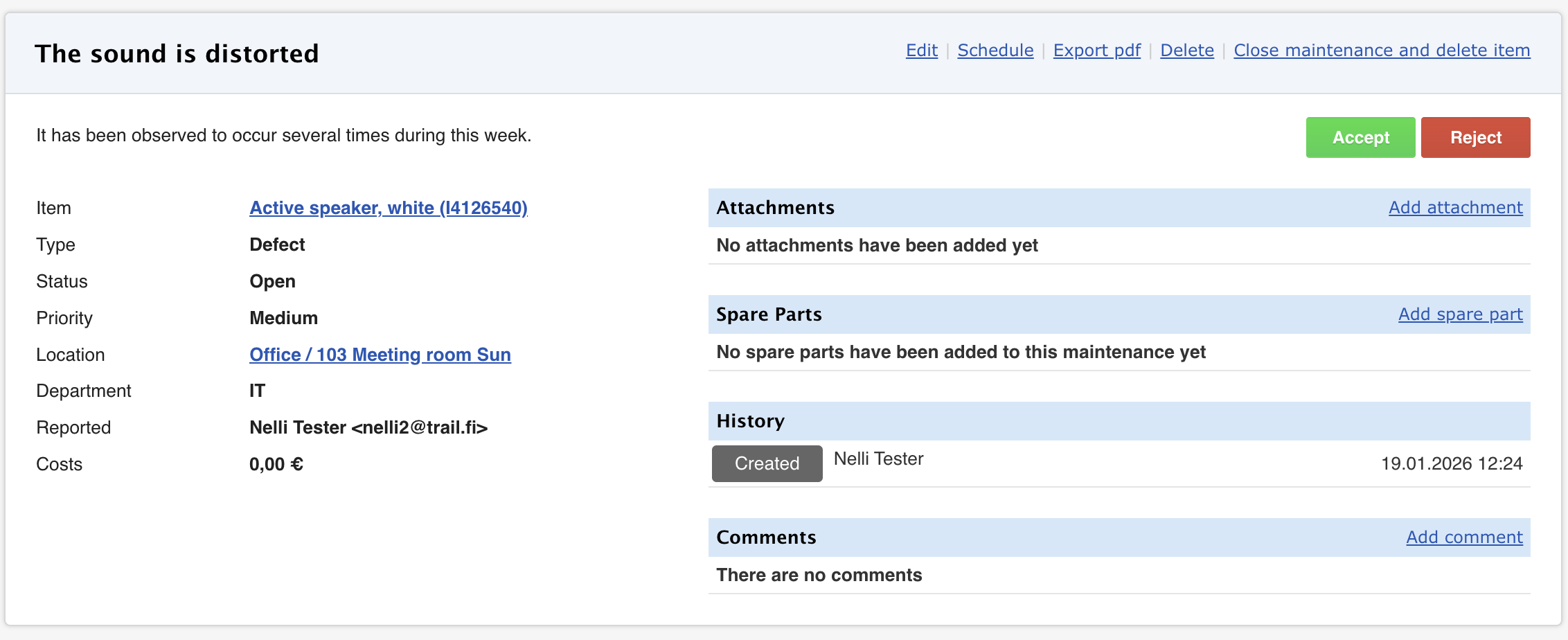 When a new defect report has been created, it should be processed as quickly as possible to ensure the safe use of the item. An item with an open defect report cannot be reserved.