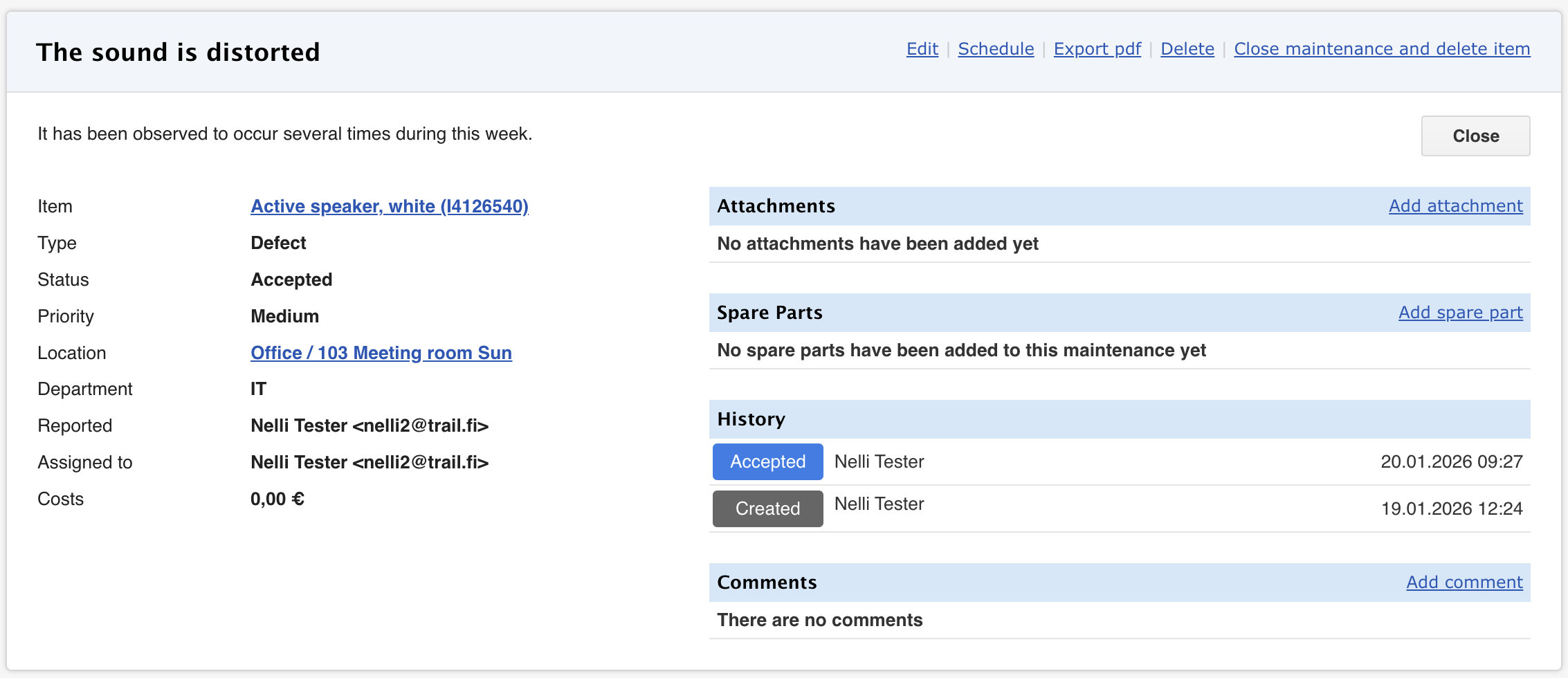 - Always check that the maintenance has been completed before closing the defect report. This helps avoid incorrect entries.