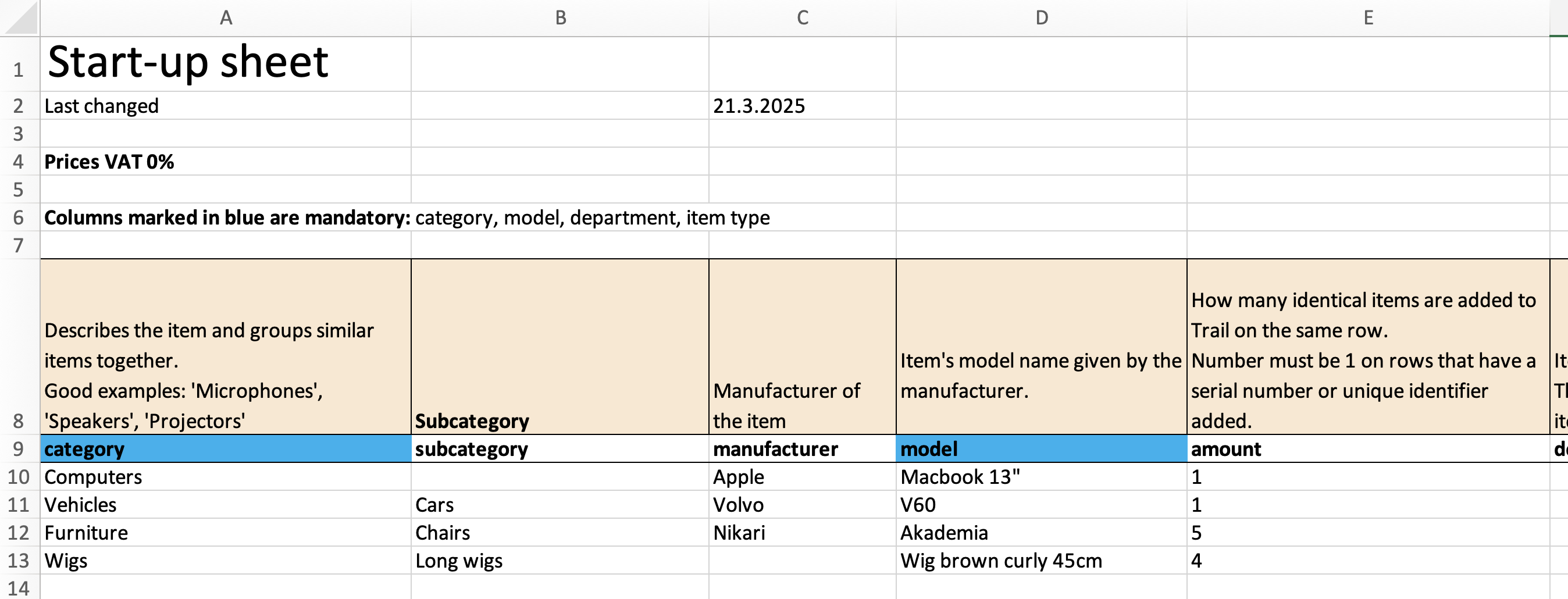 Enter the item details in the Excel file. Above each column, you’ll find a description of what kind of information should be filled in.