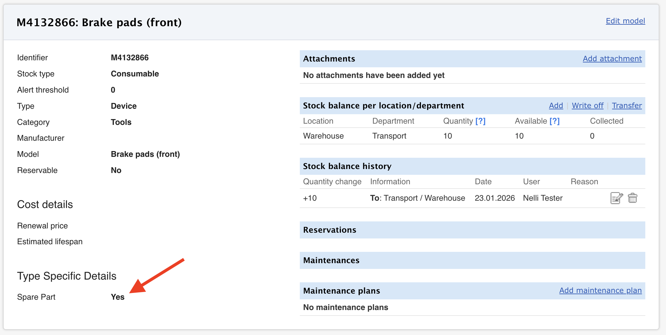 - The maintenance tasks in which the spare part has been used will appear on the model card, so you can easily track spare part usage across maintenance tasks.