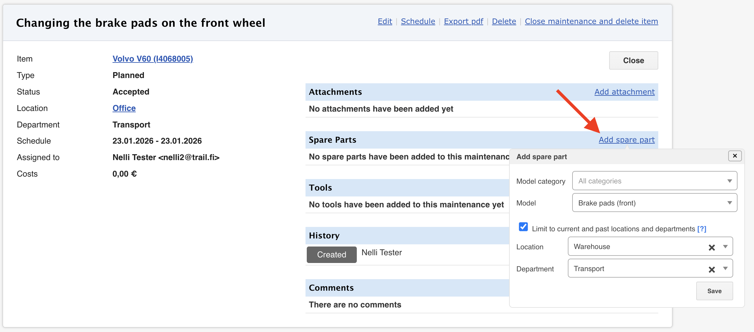 This guide explains how to add spare parts as consumables in Trail and how to use them in maintenance tasks.