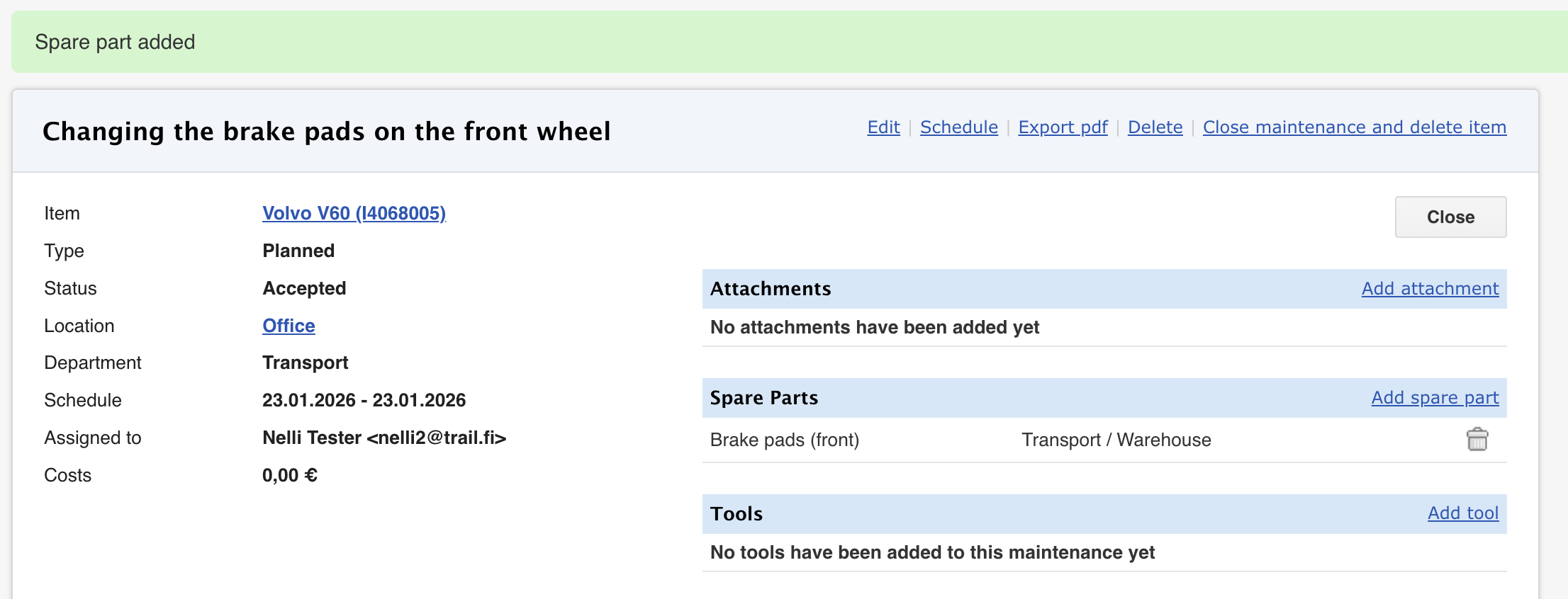 When a spare part is marked as used in a maintenance task, the system automatically reduces the quantity used from its' balance. This ensures that the number of spare parts stays up to date, and you can easily track which spare parts have been used and in which maintenance tasks.