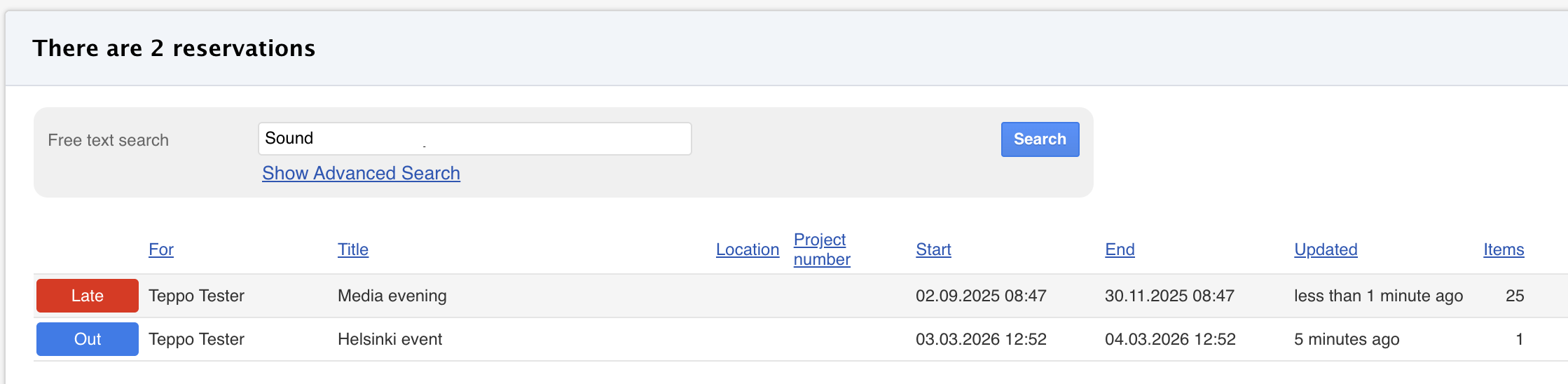 If a user has access to multiple reservation calendars, they can search for reservations by typing the reservation calendar name into the search field. The free-text search filters reservations based on the selected calendar.