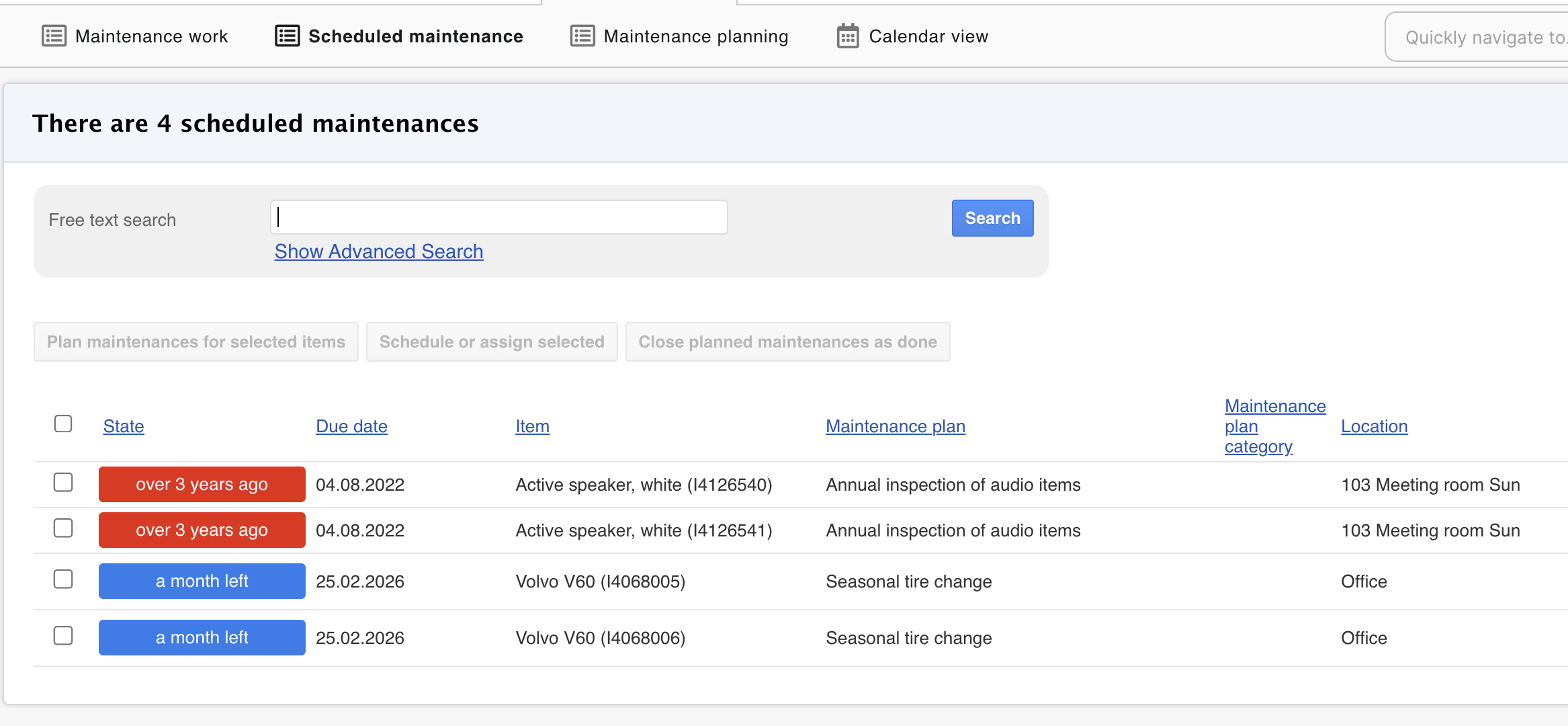 - Advanced search allows filtering the displayed maintenance tasks, e.g., by location or due date