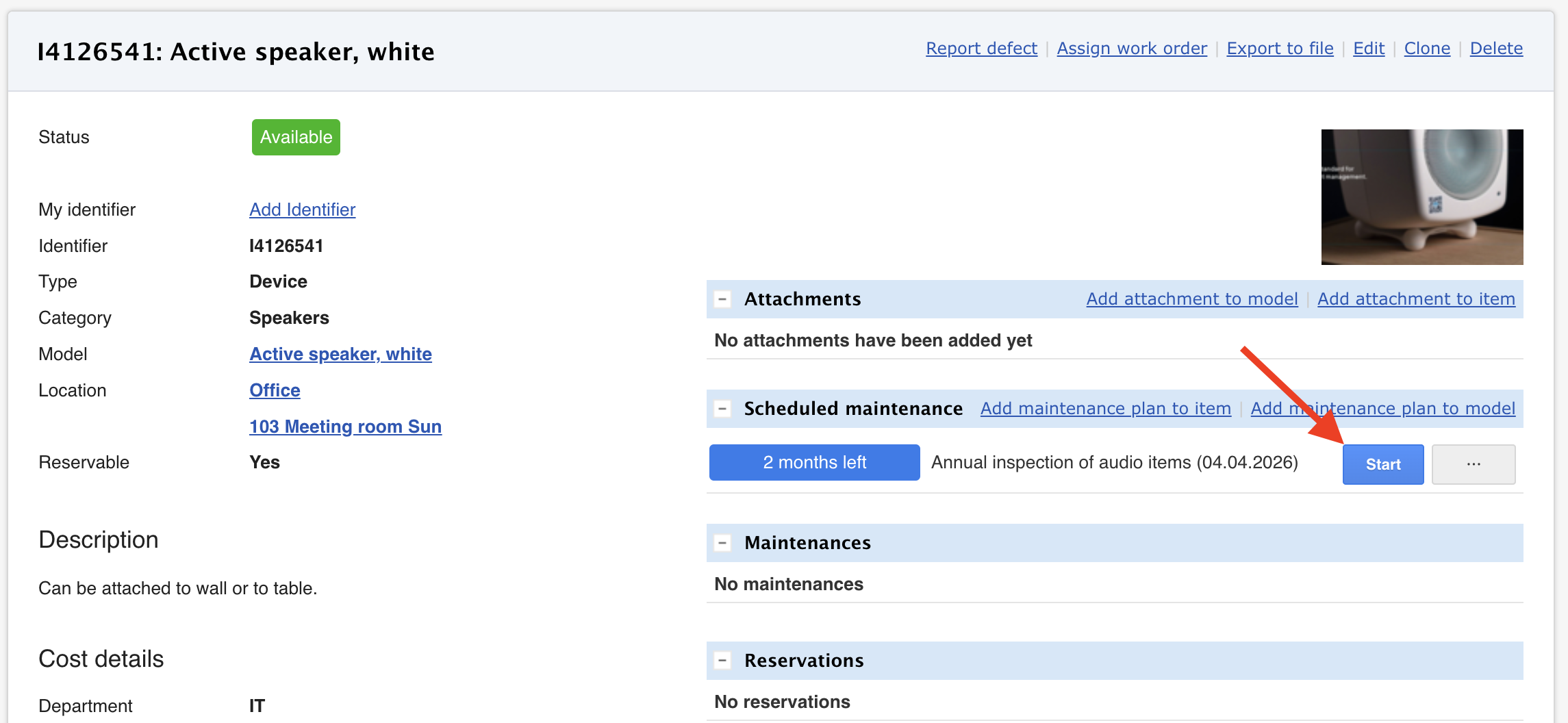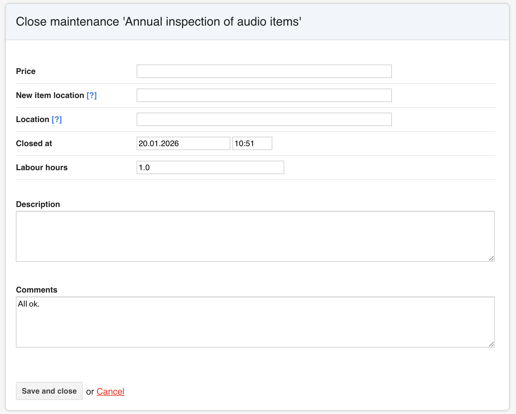 - Close maintenance and delete item – Soft-deletes the item. It can later be found via advanced search in the item list.