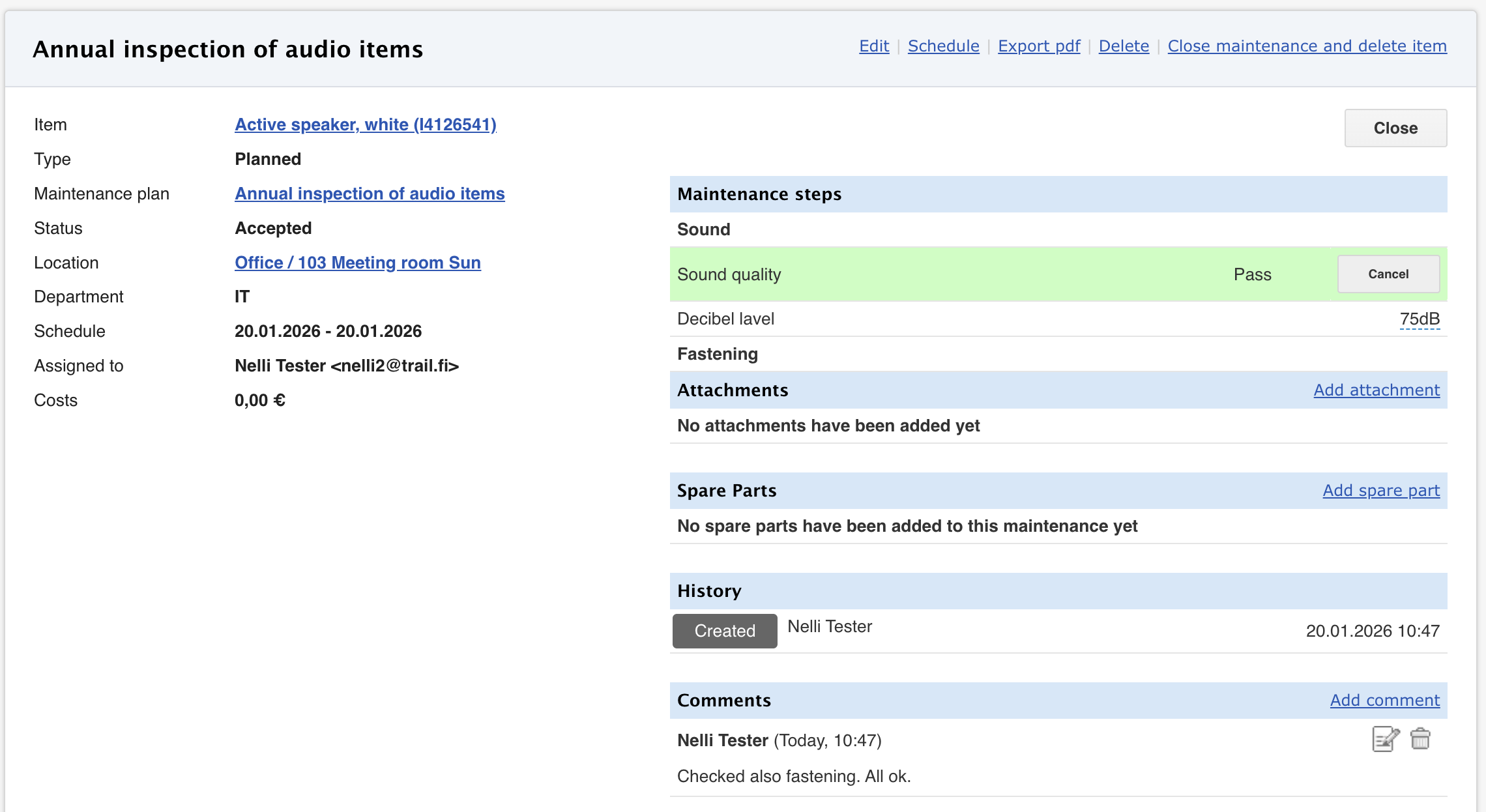 - Closed maintenance is recorded in item card's maintenance history, and the maintenance plan’s date counter is reset.