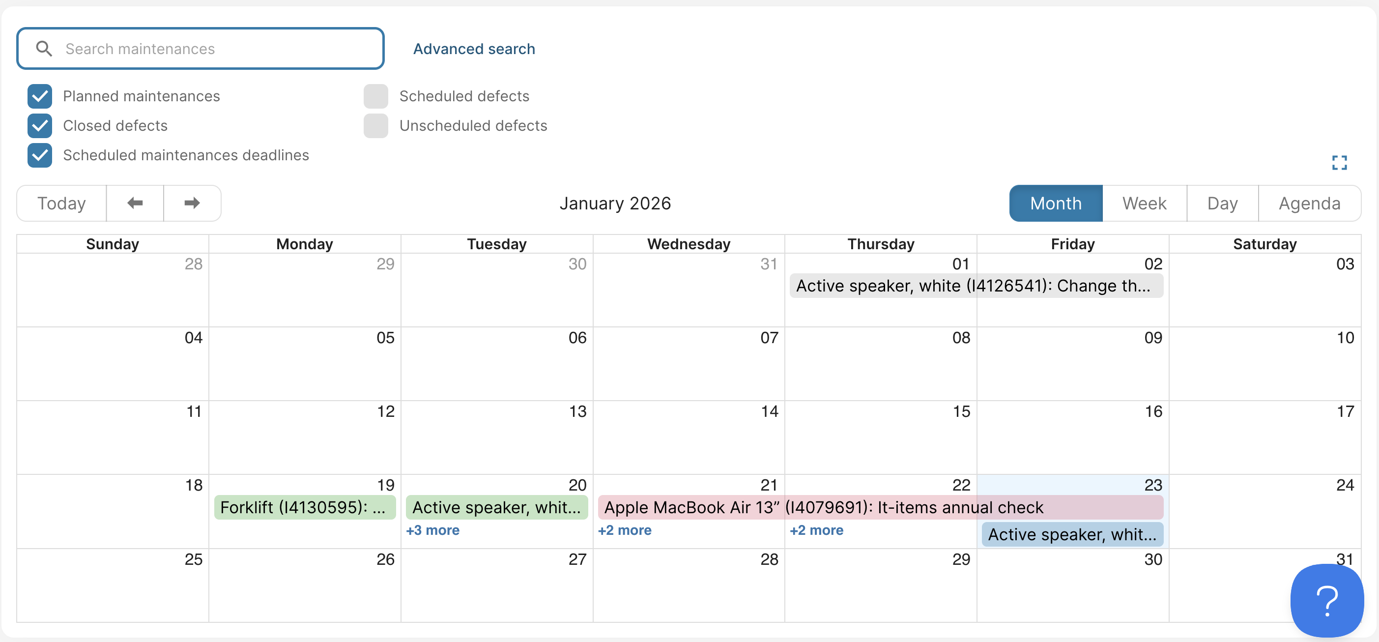 In the calendar, you can select which maintenance events are displayed. Available filters are: