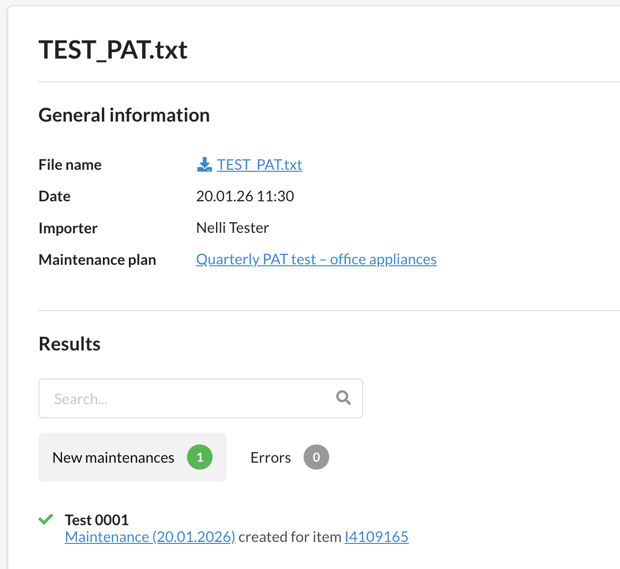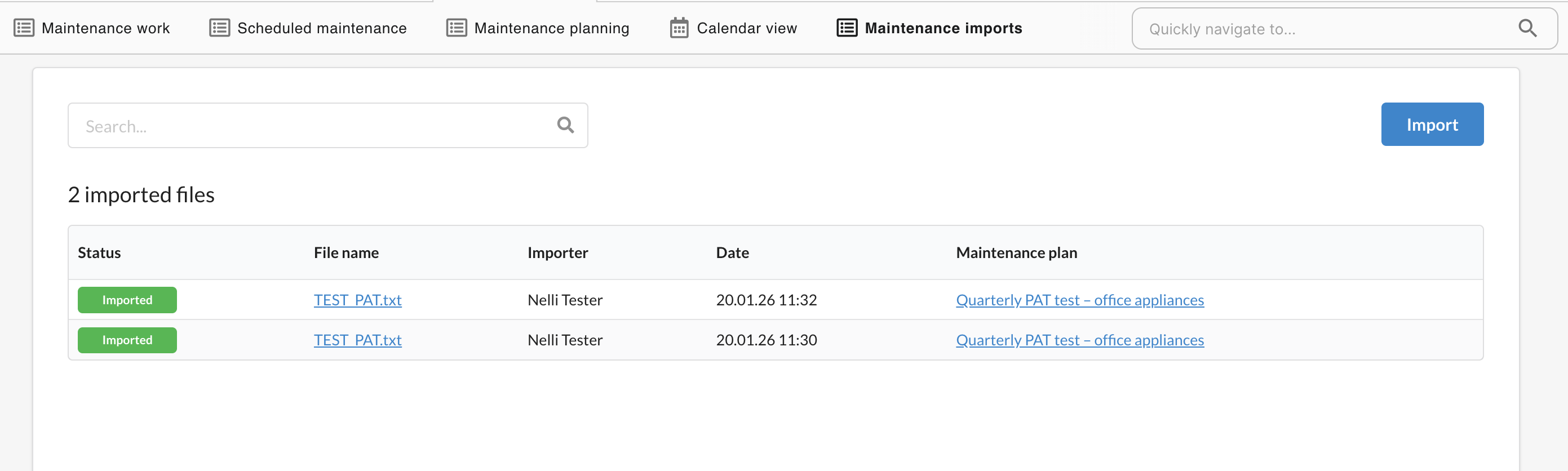 Maintenance > Maintenance Imports page allows you to quickly import PAT inspection (also called Test and Tag) reports directly into Trail from a provided file.