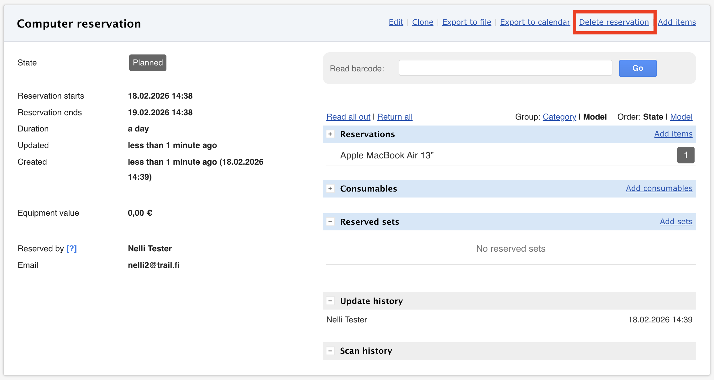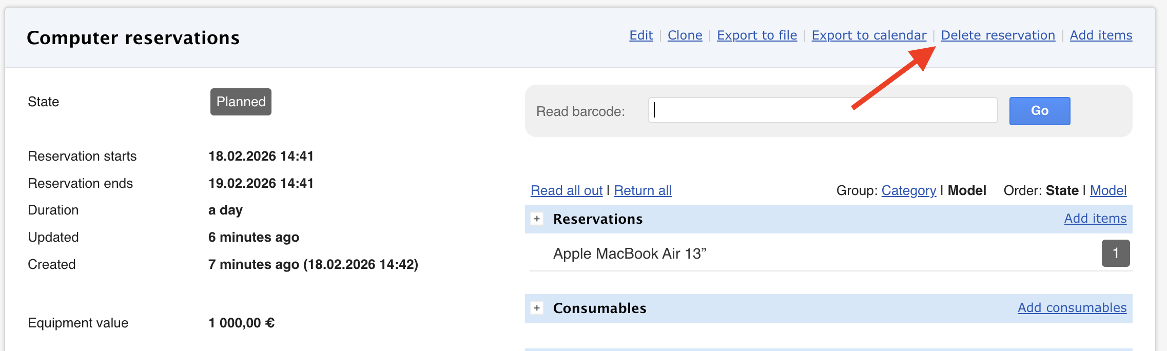 Once at least one item has been read out, the "Delete Reservation" button disappears. This ensures the system retains information about who used the items.